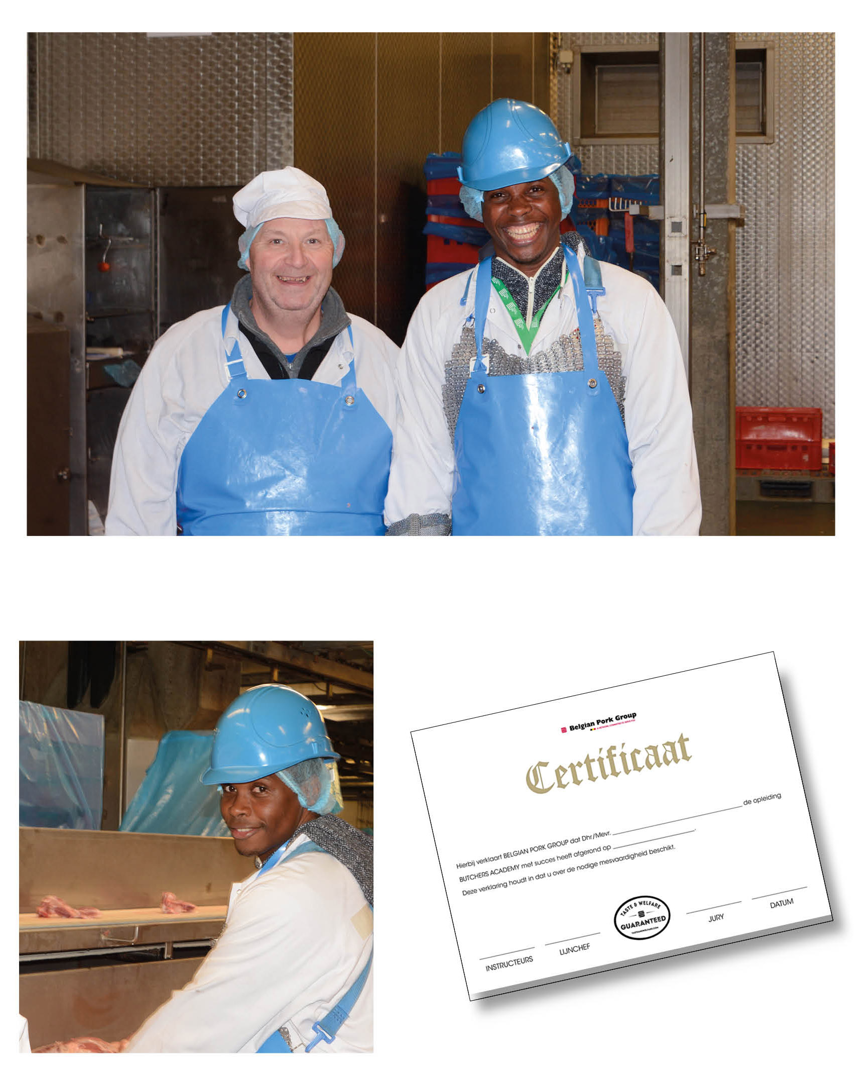 Ik mocht mij aansluiten bij de studenten van onze Butchers Academy, het intern opleidingsproject van BPG waar ik onder toezicht van collega Régis Rapoye de kneepjes van het vak leerde. Ik startte deze opleiding met wat voorkennis, want ik had in mijn thuisland Kameroen ook al ervaring in de sector opgedaan. Maar hier heb ik nog heel wat bijgeleerd. Daar wil ik Régis langs deze weg nog eens extra voor bedanken. Het is mede dankzij hem dat ik met steeds meer zelfstandigheid mijn taken in de snijzaal mag afwerken en meer verantwoordelijkheid mag nemen. Na zijn opleiding kan ik nog rekenen op de hulp van andere collega’s zoals Freddy, die ons blijven opvolgen en ons met raad en daad bijstaan.