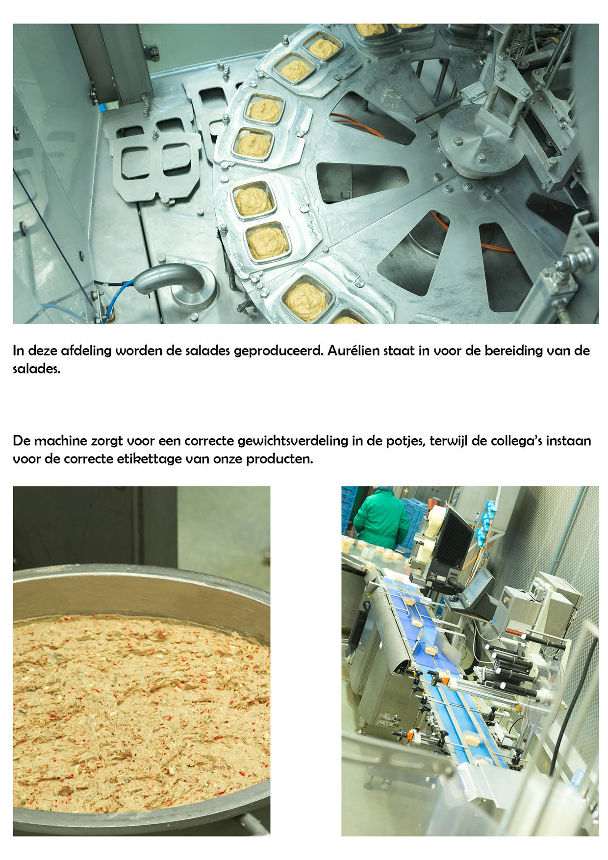 Hier worden alle salades gemaakt die in ons gamma zitten. Dit gaat van tonijnsalade tot krabsalade, vleessalade, garnaalsalade, enz. ‘s Morgens start ik de dag om 5 uur en zet ik alles klaar. Pompen worden aangesloten, alle nodige grondstoffen worden klaargezet en uitgewogen, en dan start ik met de samenstelling van de salades. Elke salade is afhankelijk van zijn eigen voorgeschreven receptuur. Wanneer deze salades klaar zijn nemen mijn collega’s over. Zij zorgen voor de correcte portionering in de schaaltjes, en voor de correcte etiketten.