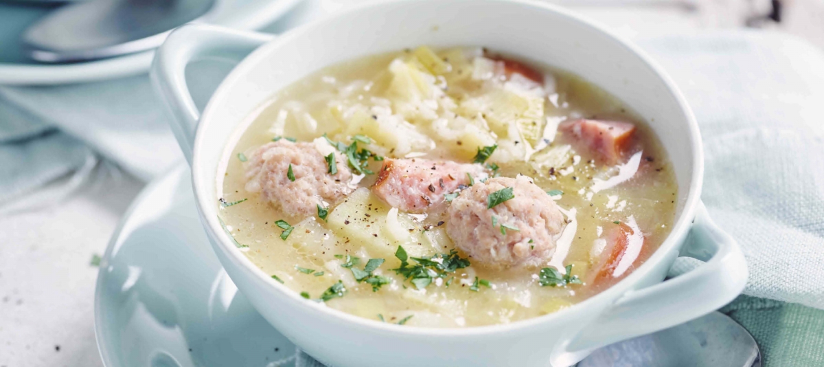 3. Rol balletjes van het gehakt en voeg toe aan de soep. Breng verder nog op smaak met peper (zout zal niet nodig zijn). Als de balletje komen boven drijven is de soep klaar. Laat nog 10 minuten rusten en serveer.